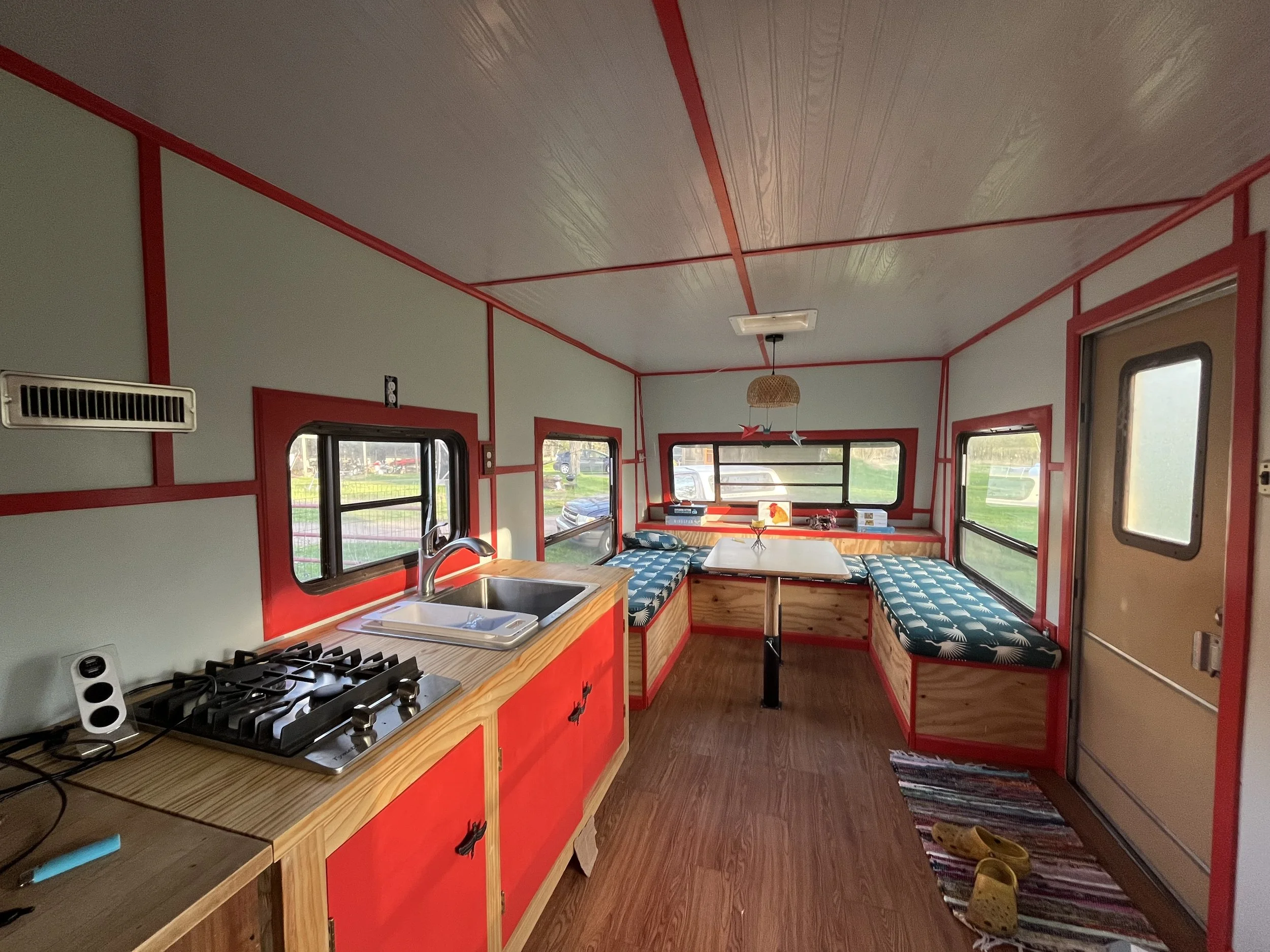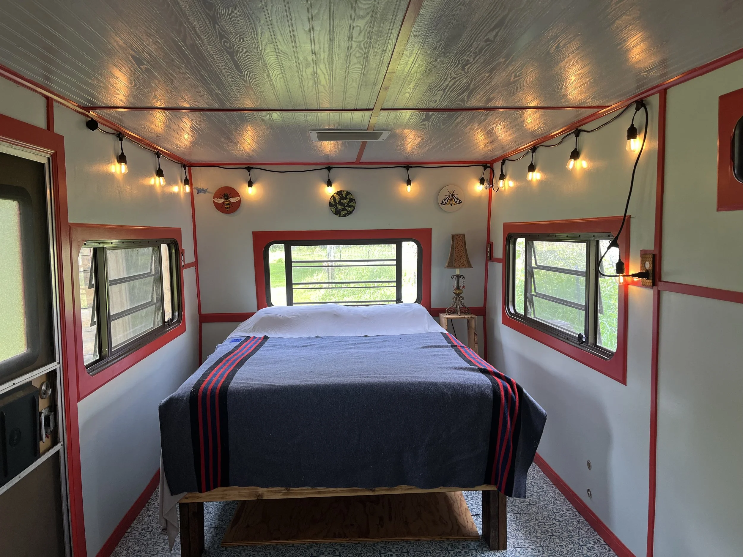 Spend the weekend in our 30 foot, eco-friendly, rehabbed vintage Mallard Trailer. Rebuilt using many recycled materials, electrified with solar panels and decorated with creative flare, you are certain to enjoy your stay in- and outside of the Sandhill Sleeper. Inside, you will find room for up to 4 people to sleep (one double bed and table nook converts to bed), a kitchenette with water and a two-burner propane stove top.